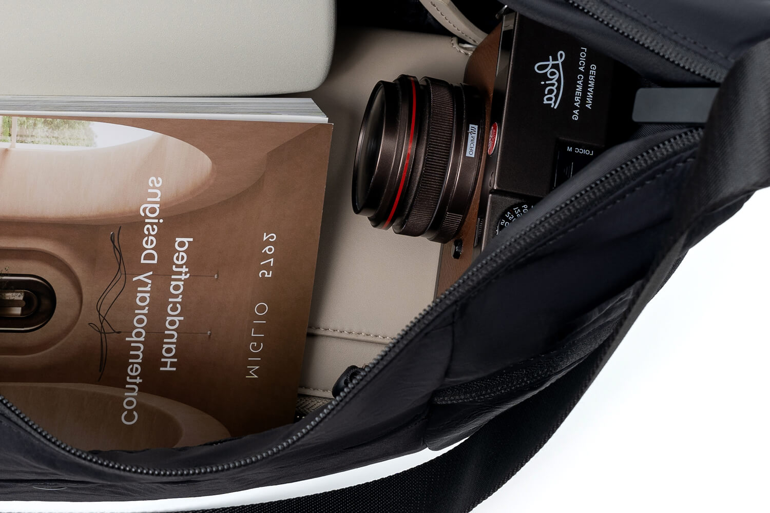 The bag has a large capacity and can hold large items such as books, cameras, and water bottles. The zippers are smooth and unlikely to get stuck.